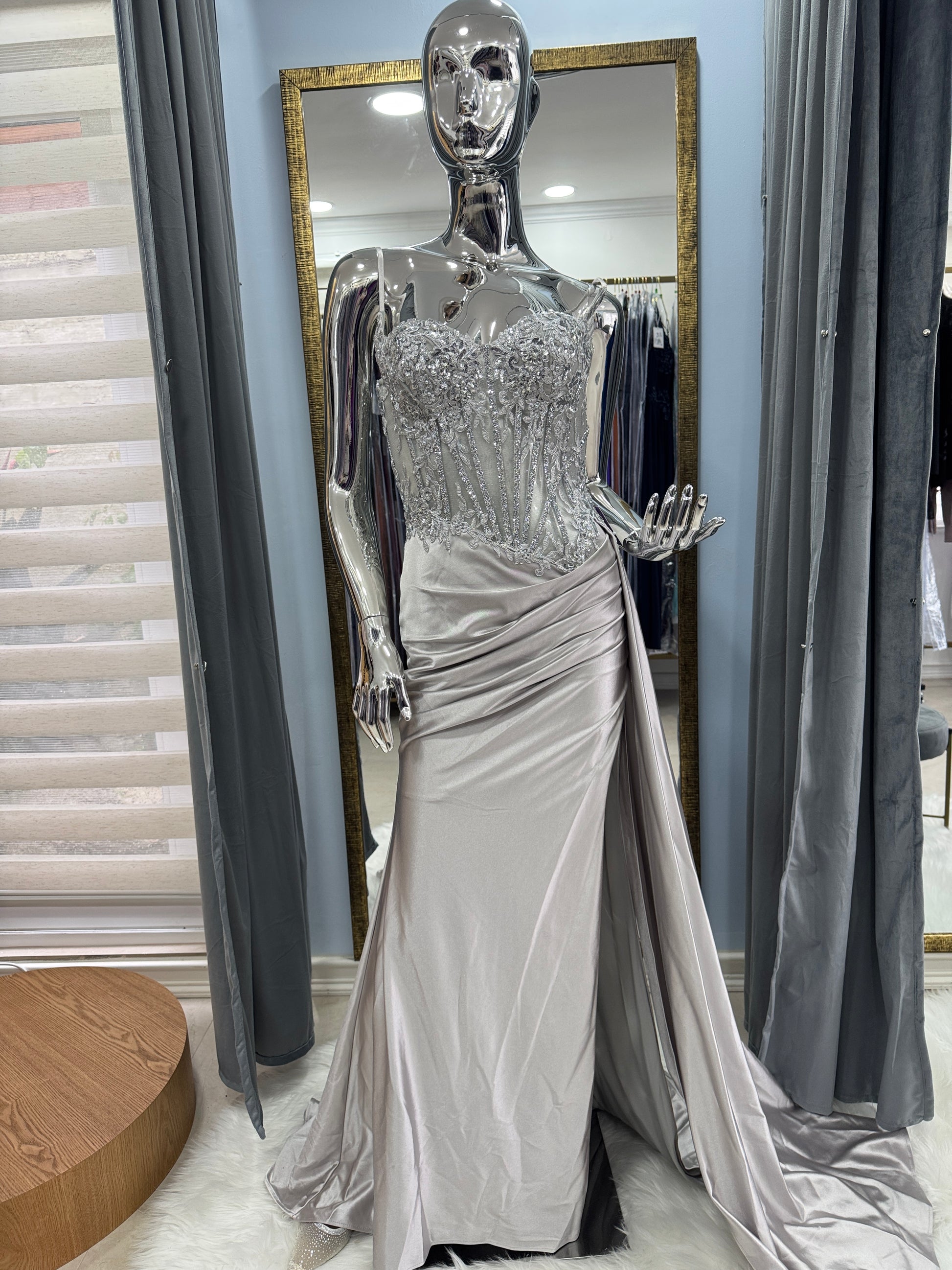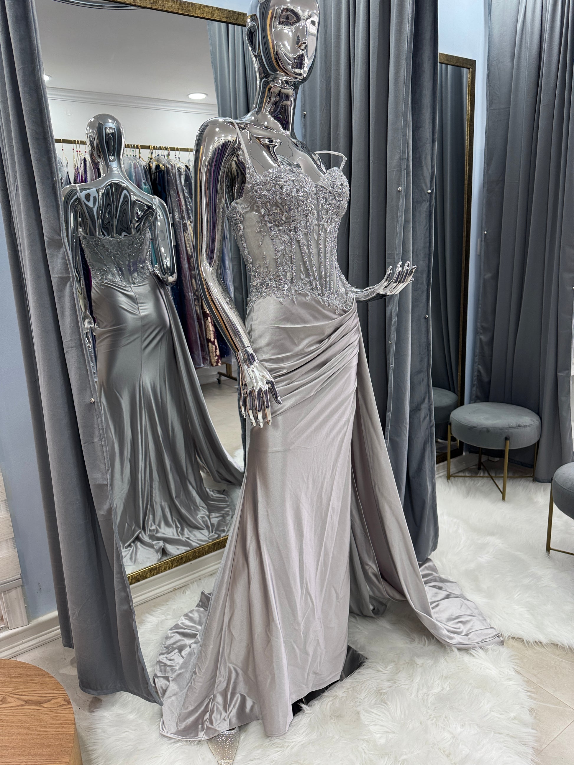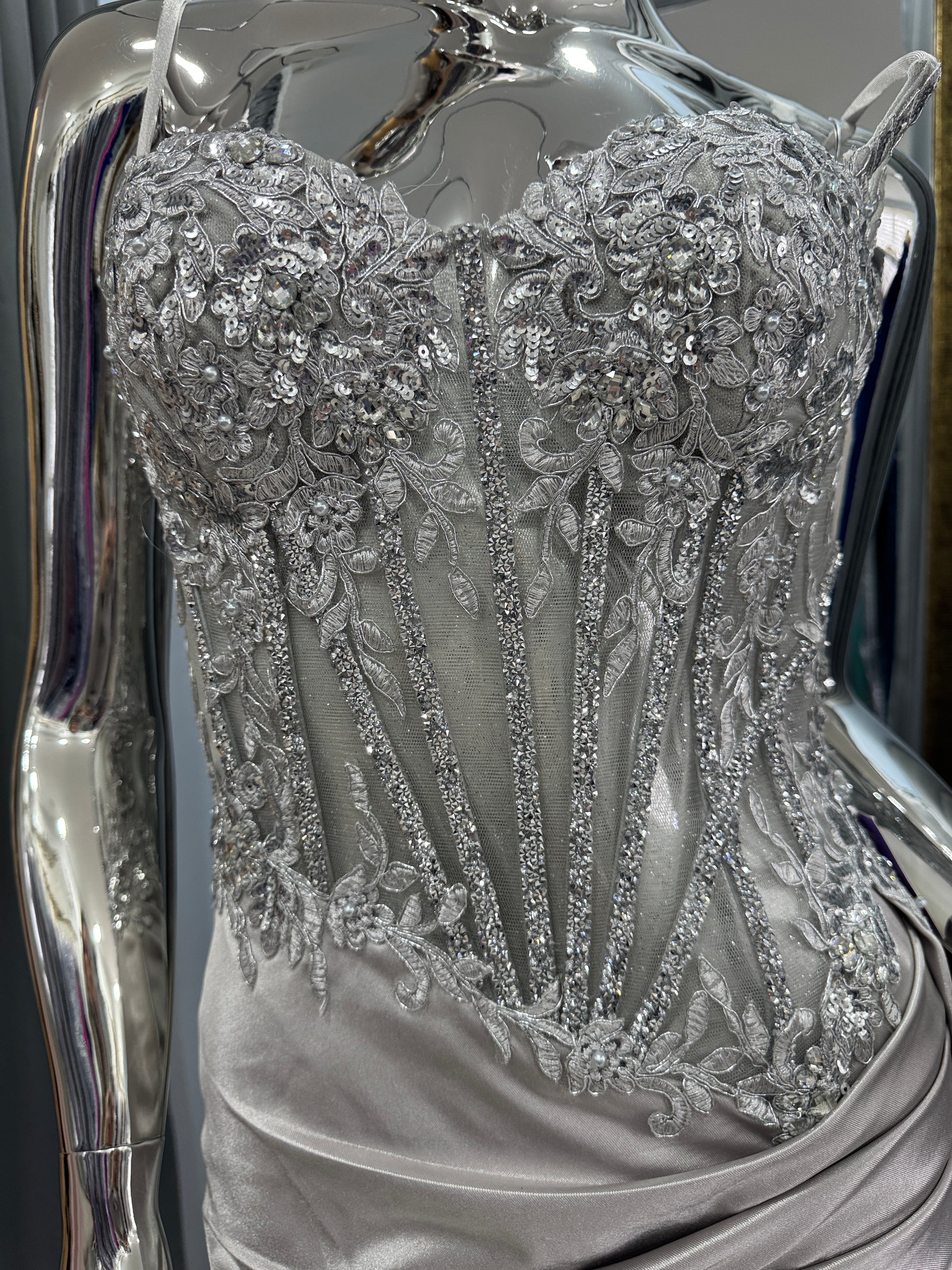 Un diseño que fusiona el arte del corset bordado con la delicadeza del satín perlado.