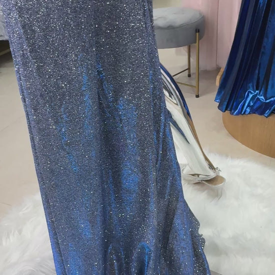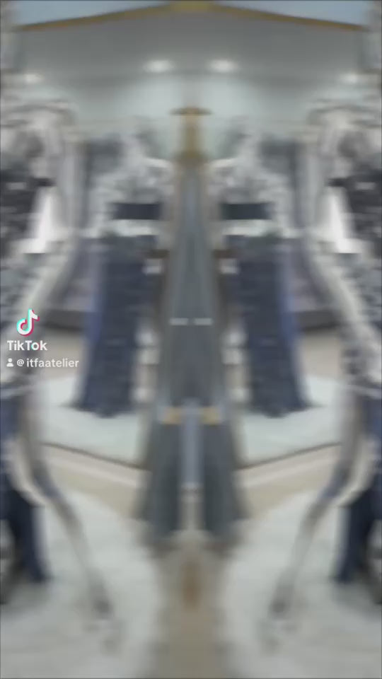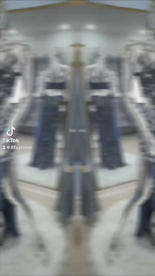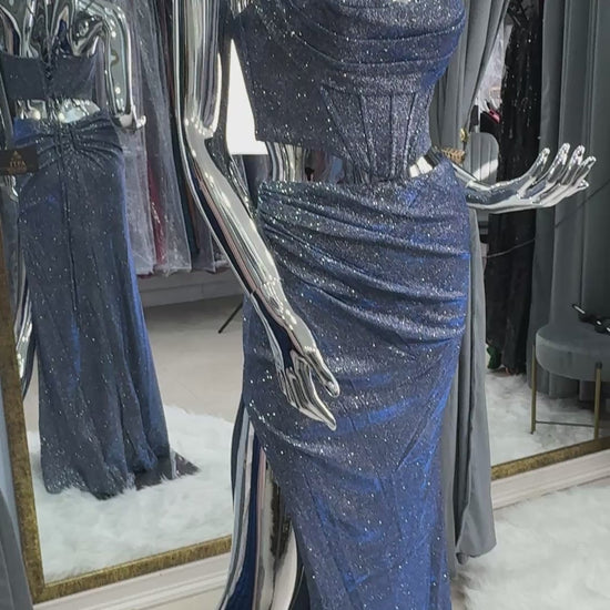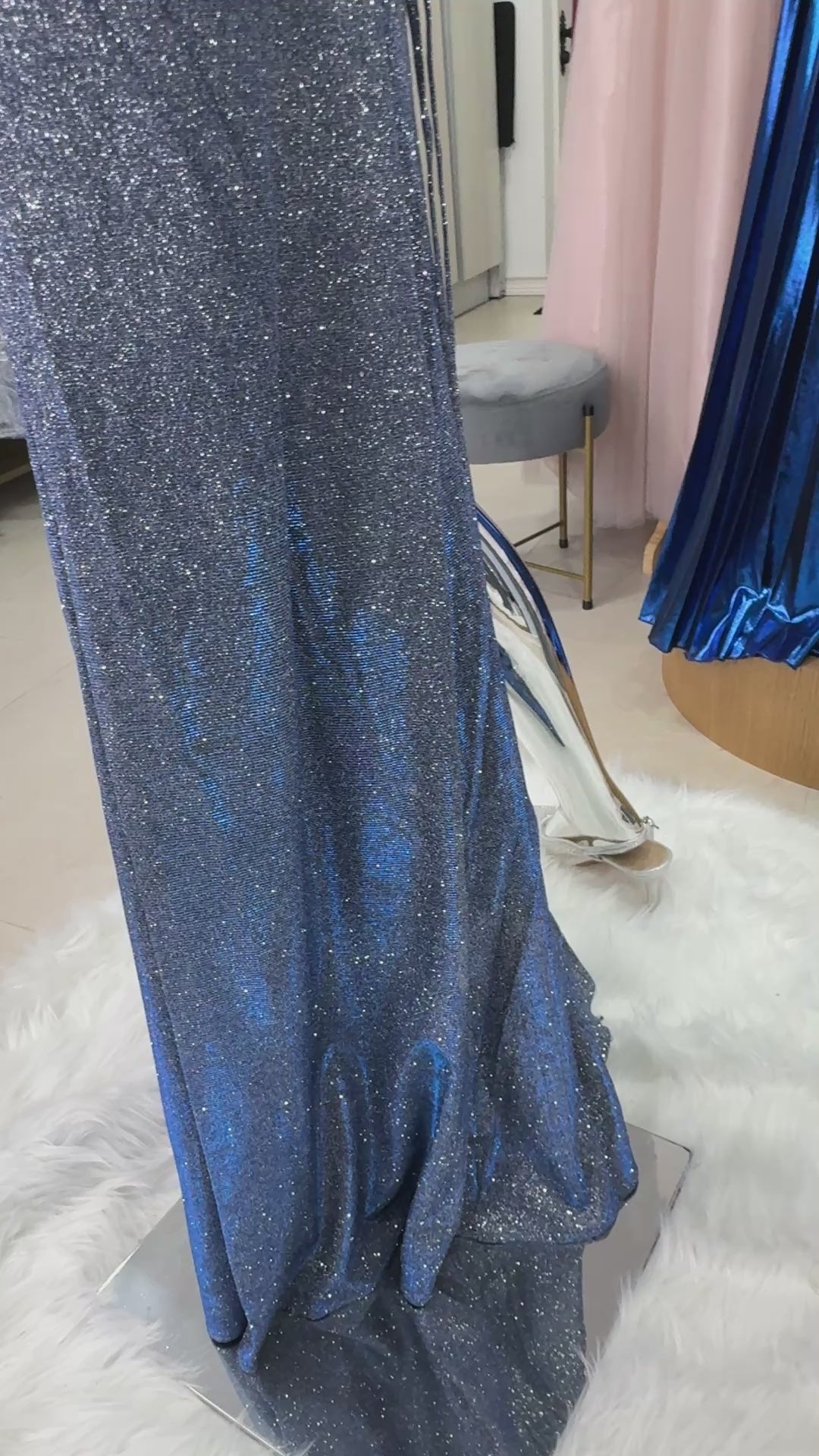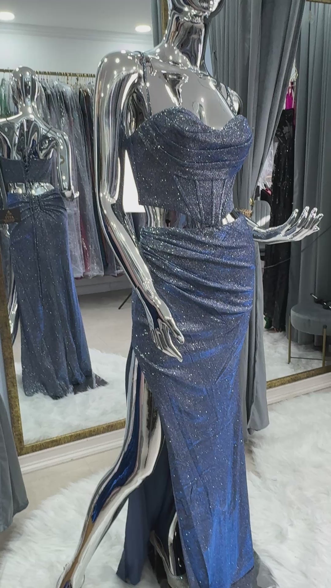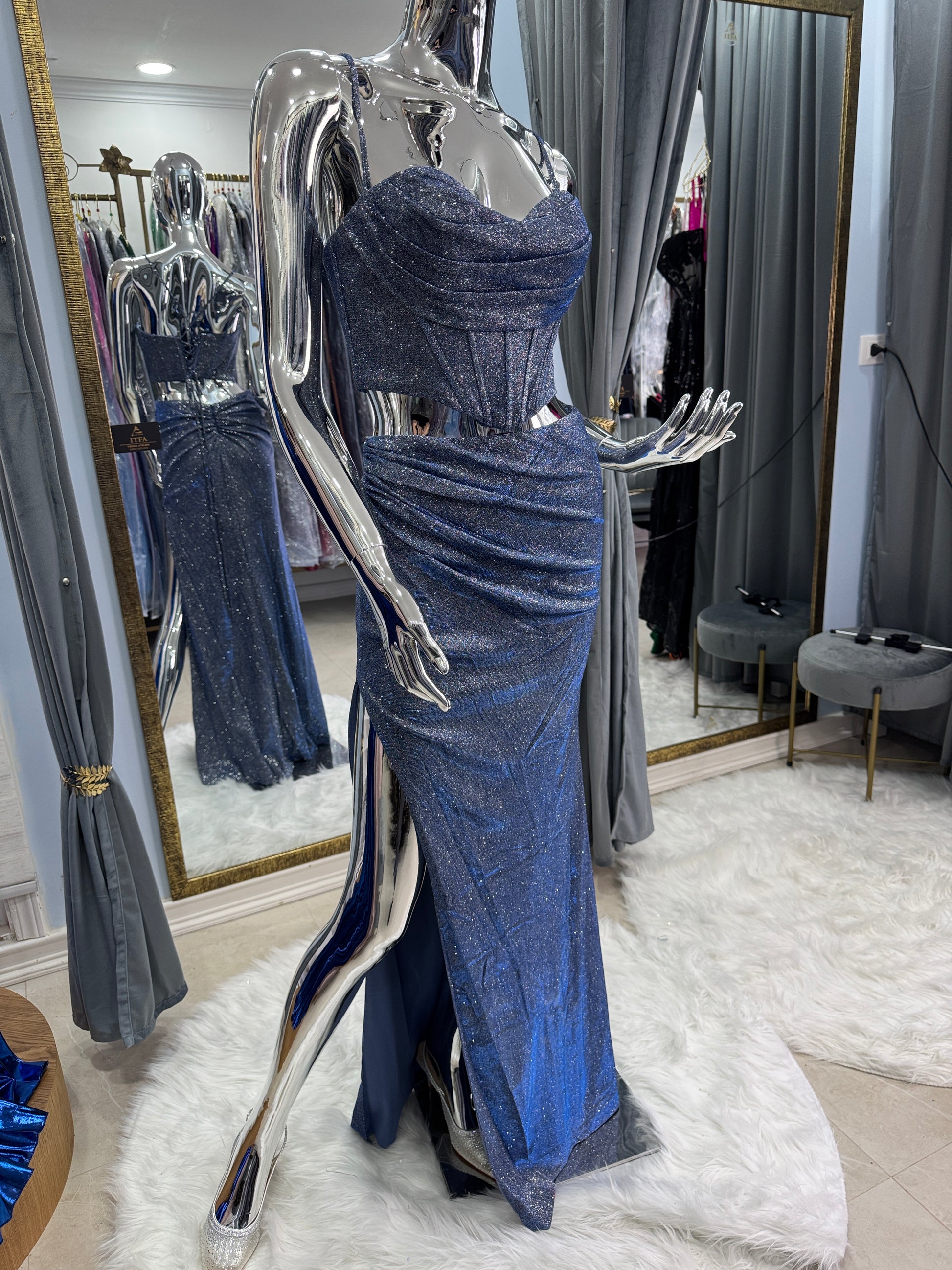 Este diseño de dos piezas cautiva con su resplandor de azules y plateados celestes, evocando el brillo del agua bajo la luz.