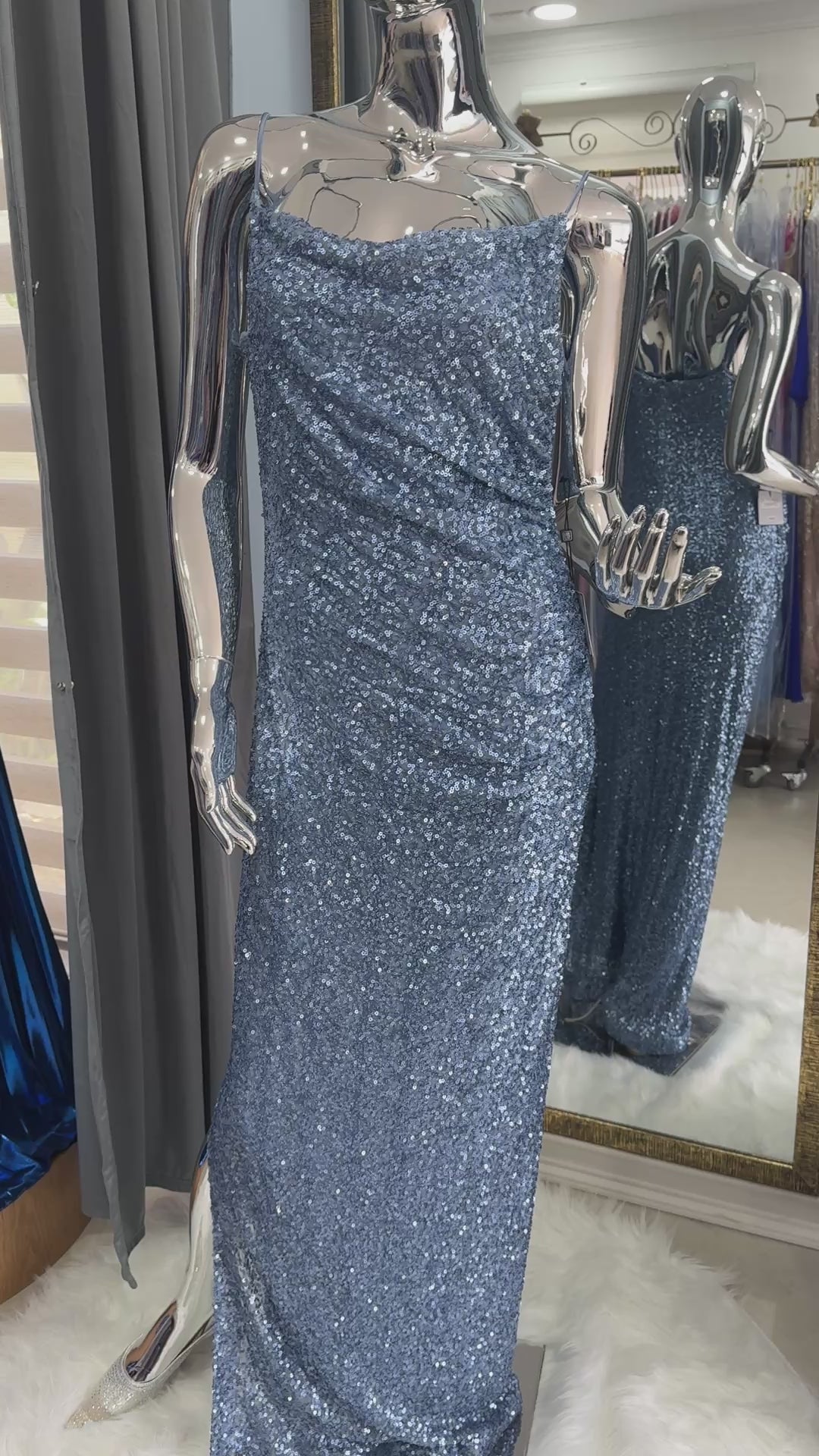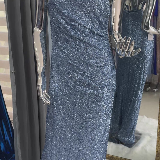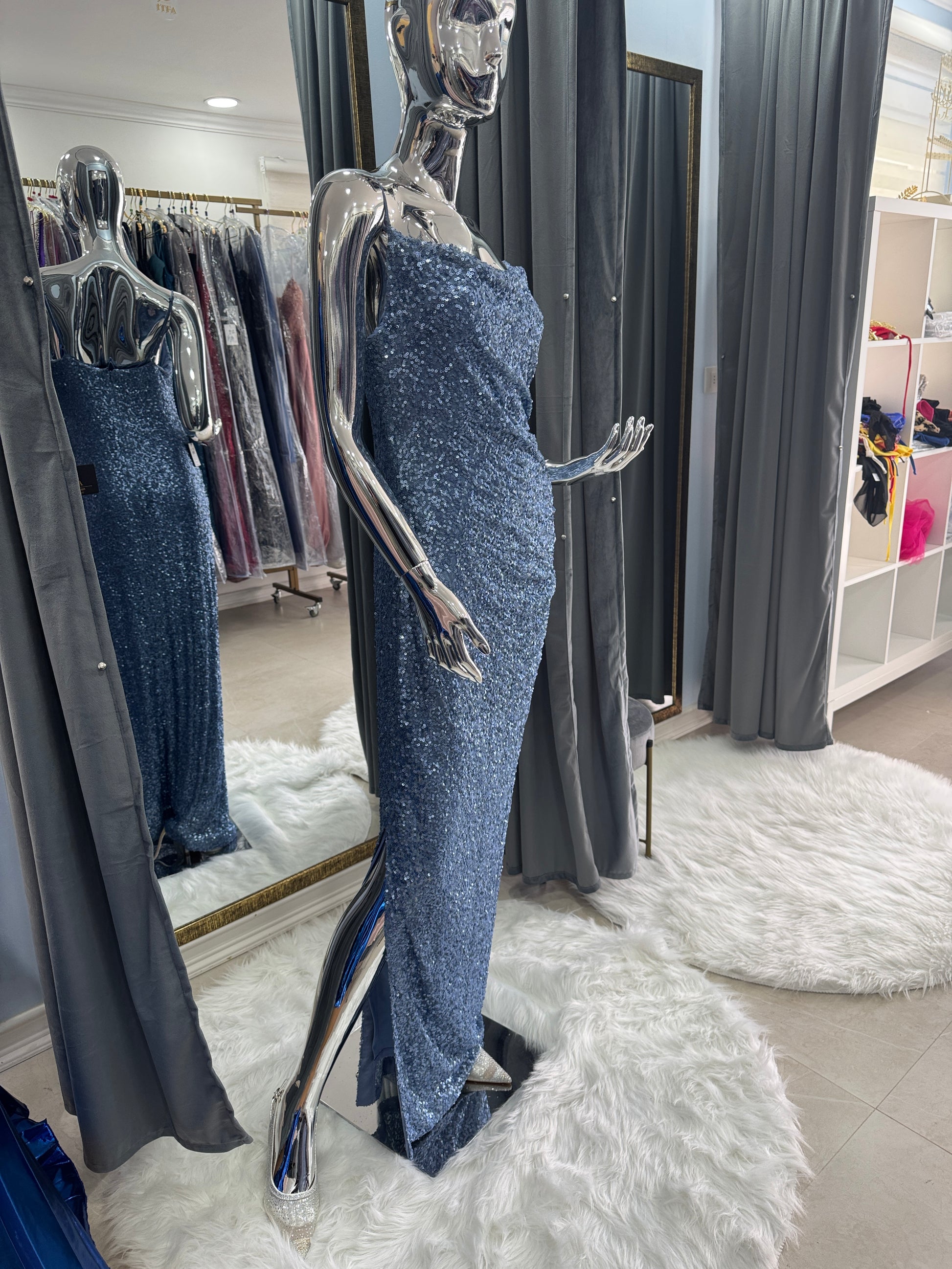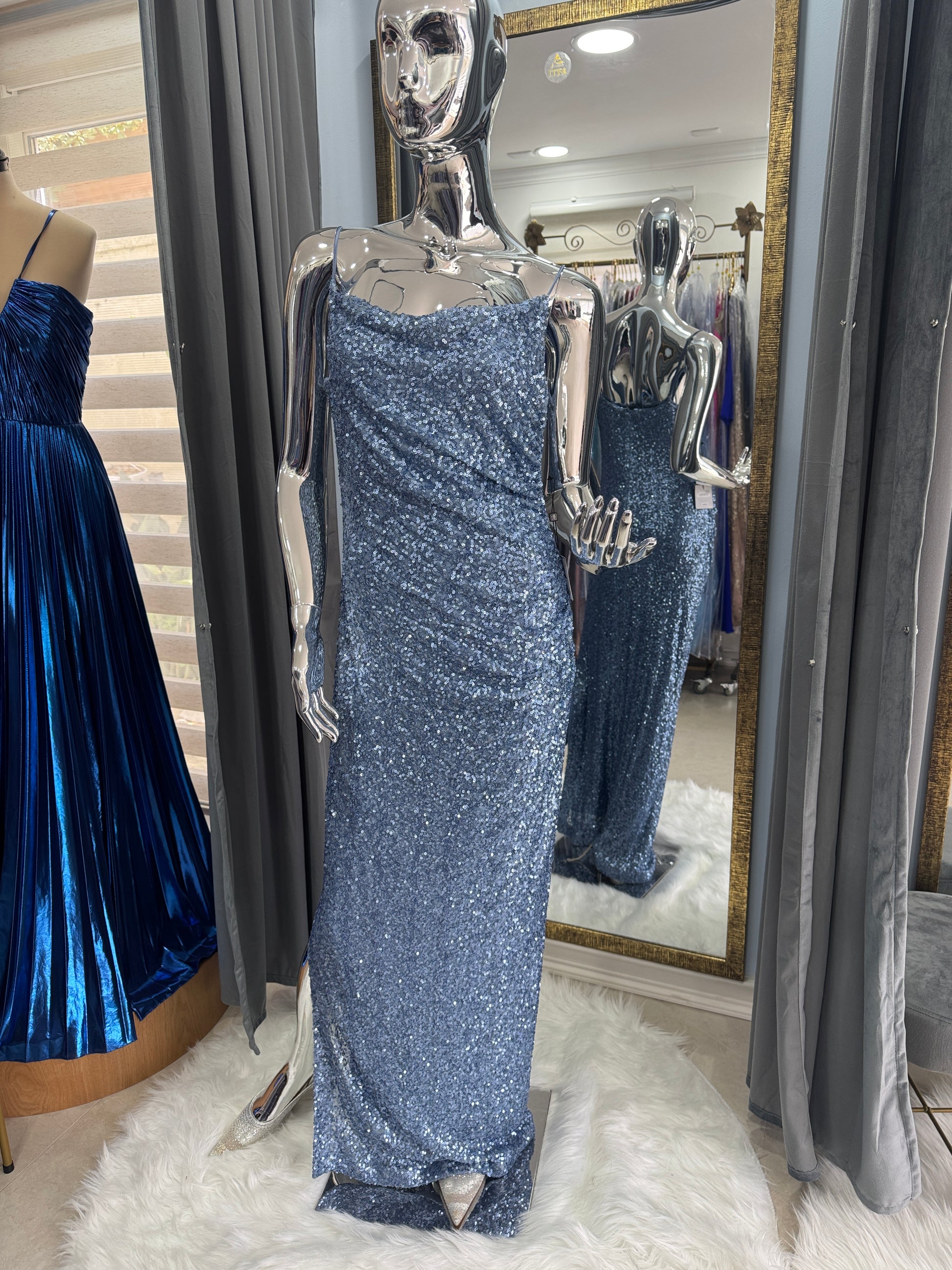 Su tono celeste con lentejuelas suaves envuelve la silueta con una sensualidad sobria y un brillo que cautiva sin exceso.