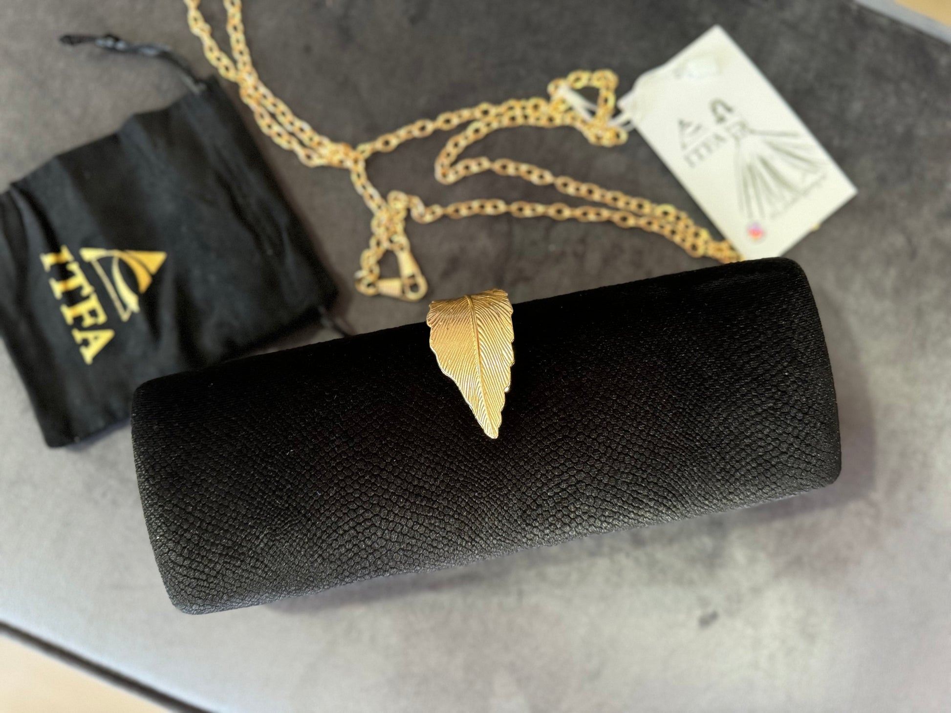 Este sobre o cartera de terciopelo es la opción ideal para una noche mágica. Con detalles dorados y su forma alargada, ofrece una mayor capacidad para transportar todos tus artículos con elegancia. Su diseño original te permite llevar todo lo que necesitas sin perder estilo. ¡Haz que tu noche sea aún más especial con este accesorio de terciopelo!