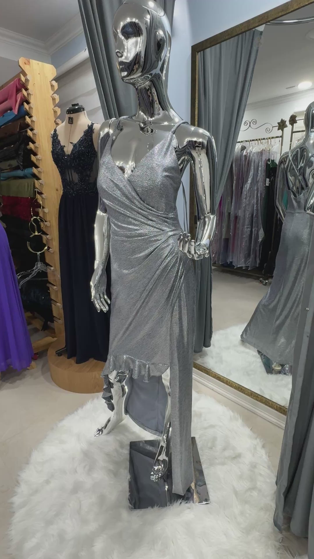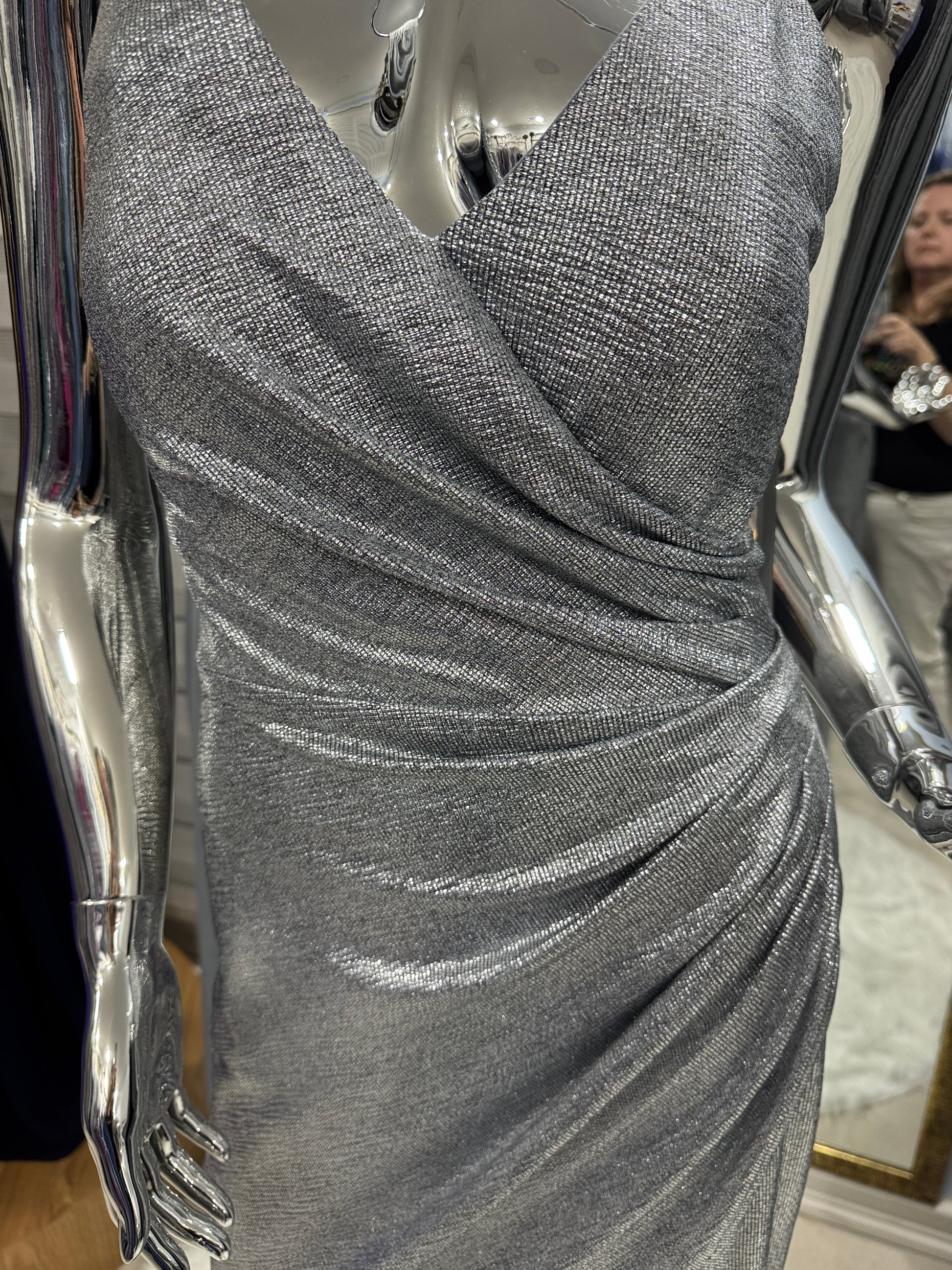 Vestido de fiesta nuevo, de diseño exclusivo ITFA, confeccionado en tela elasticada con brillo plata, que se adapta cómodamente al cuerpo y estiliza la silueta.