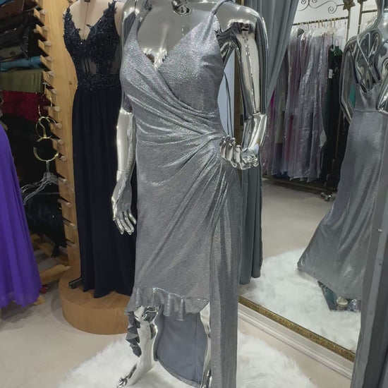 Vestido de Fiesta Plata Asimétrico con Drapeado – Talla M/L