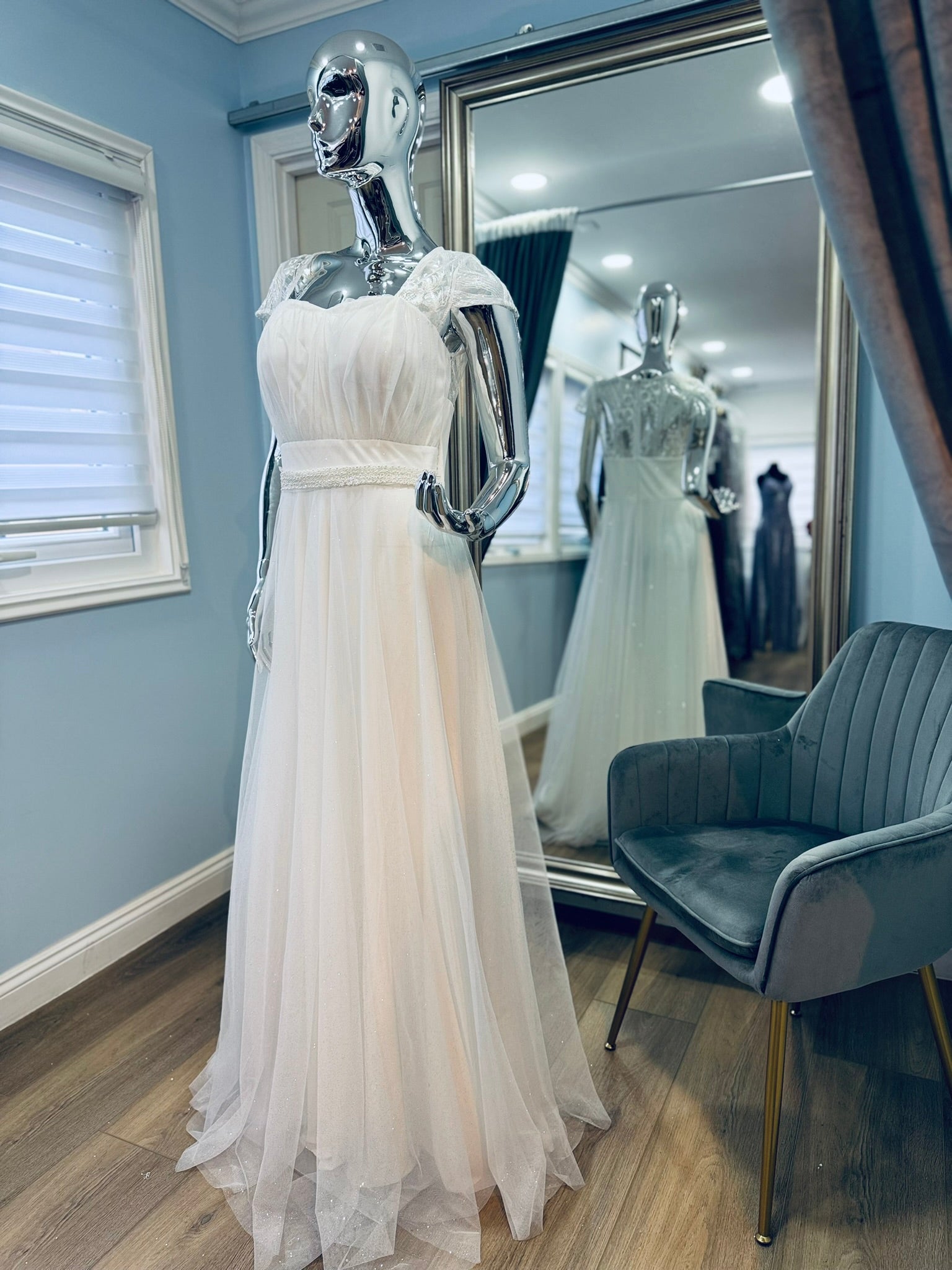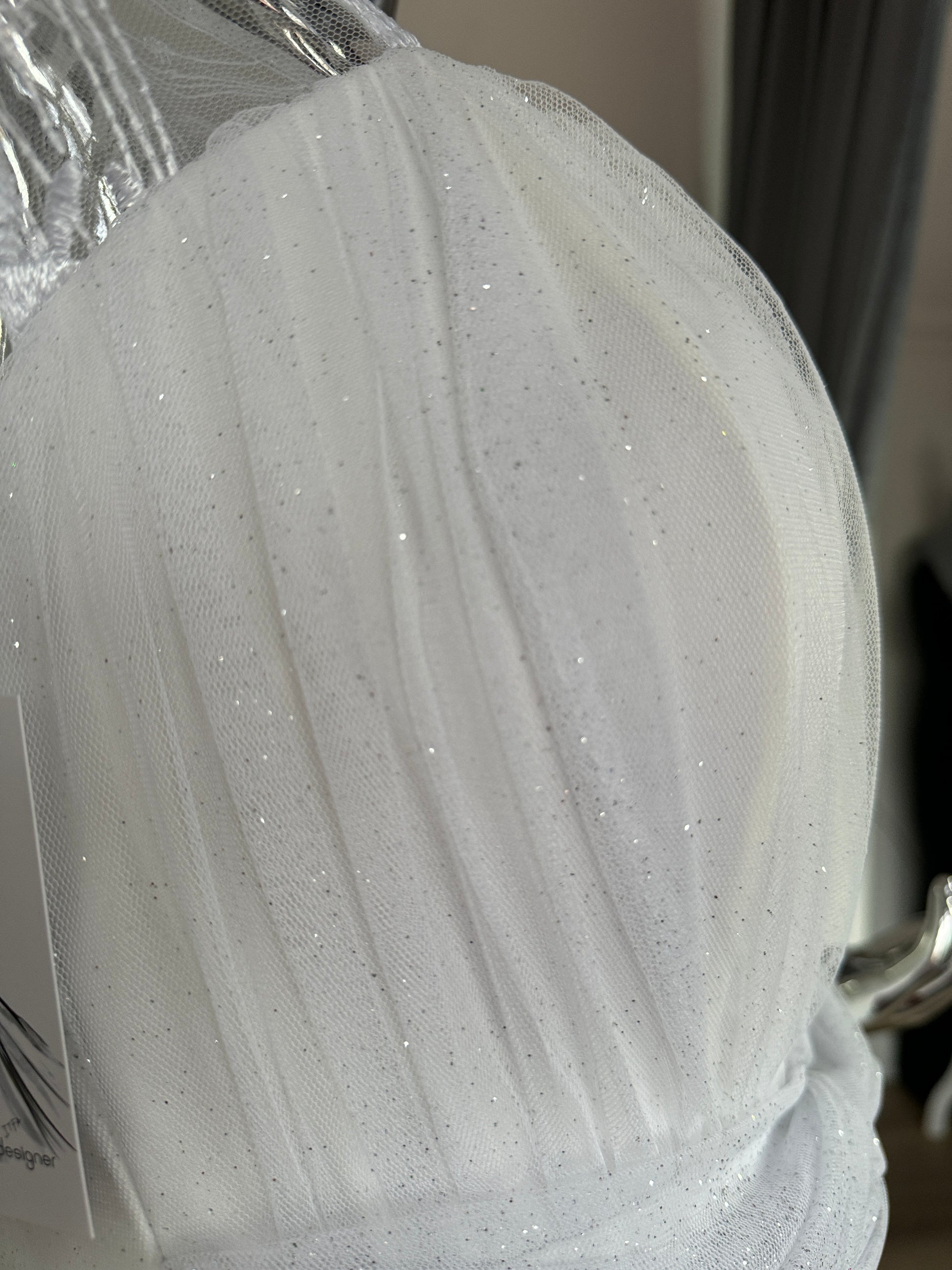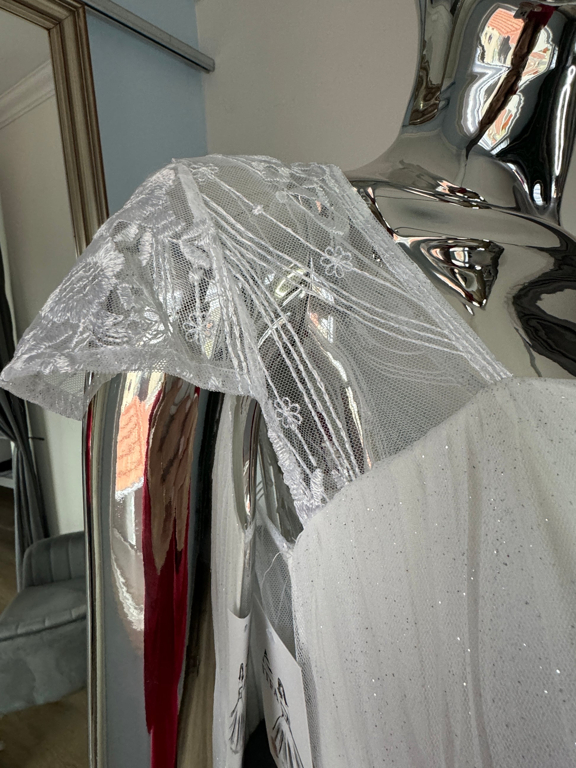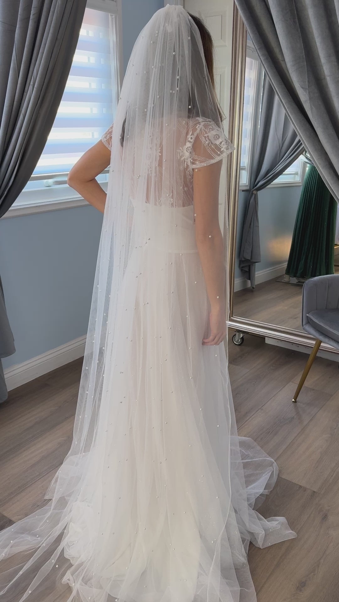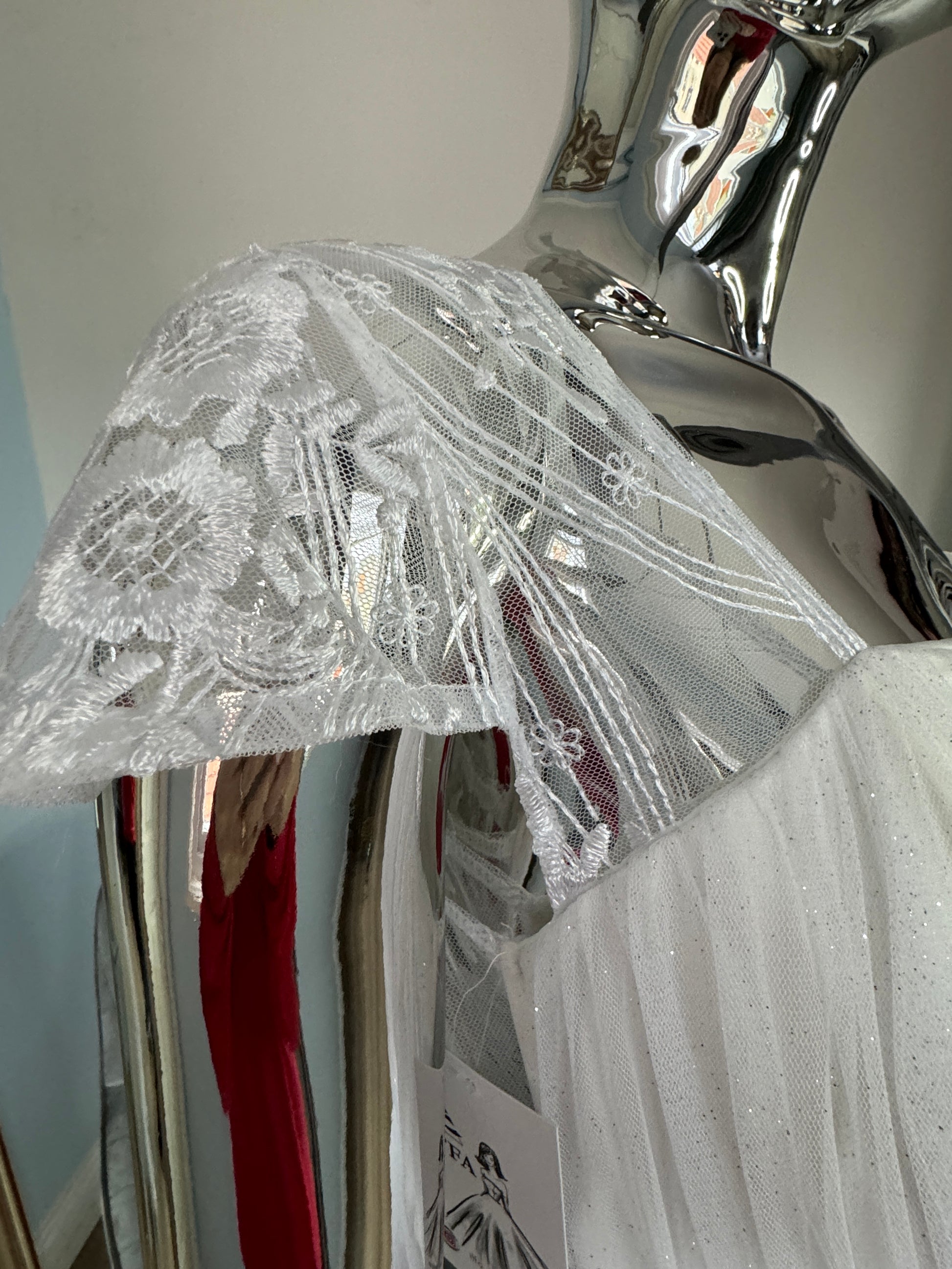 Este encantador vestido Toscana presenta delicadas transparencias bordadas en la espalda, los hombros y las pequeñas mangas que realzan la figura y cautivan a tus invitados. Con sutiles destellos en el tul, este vestido aporta un toque mágico y está forrado, excepto en las transparencias. ¡Será el vestido perfecto para tu gran día!