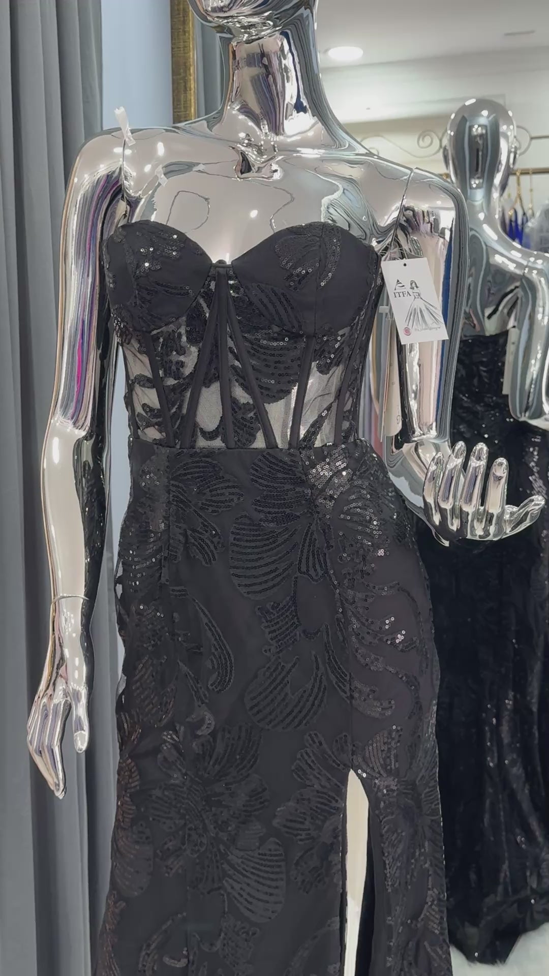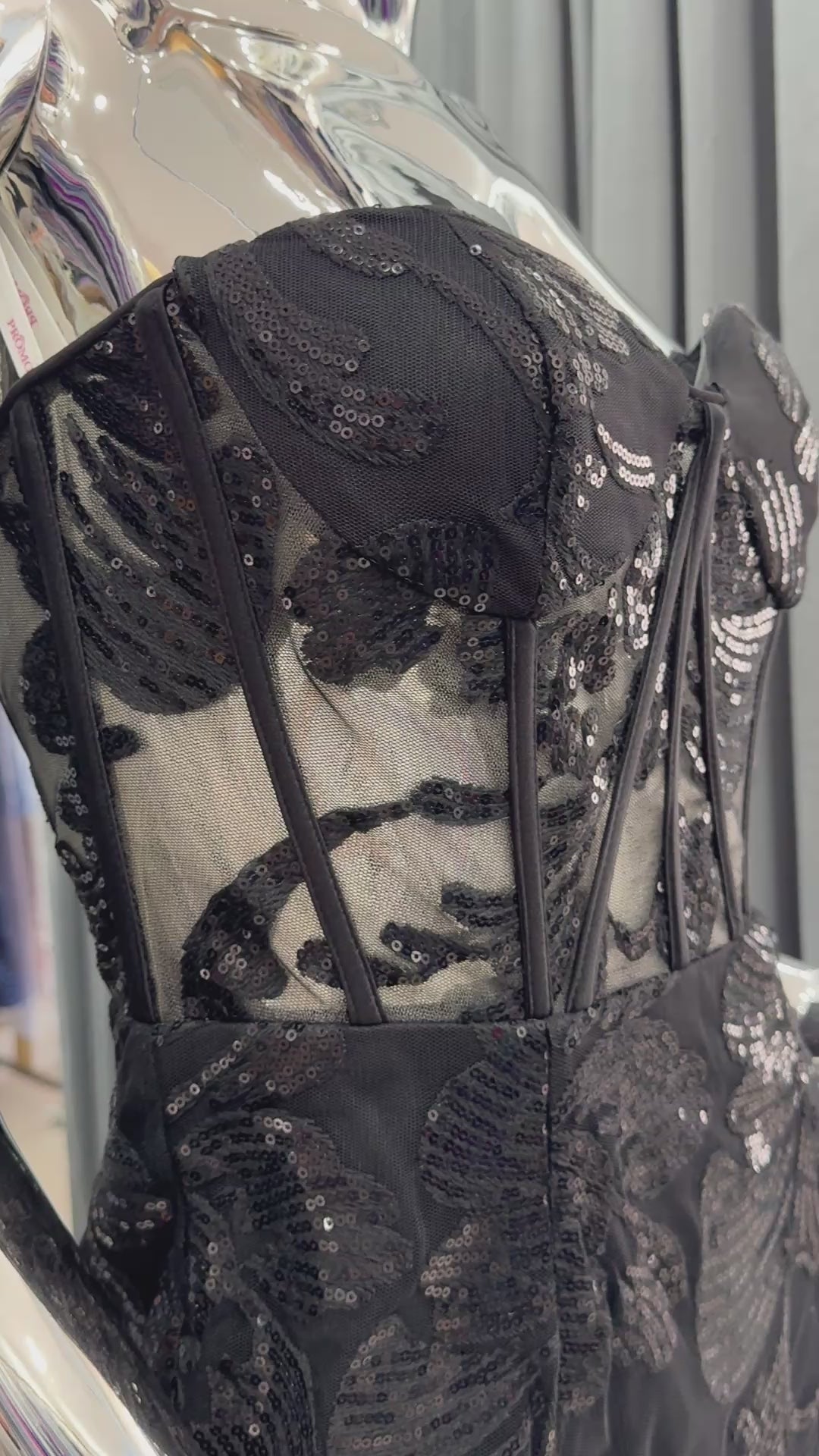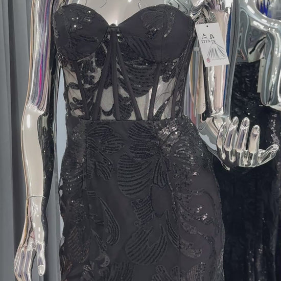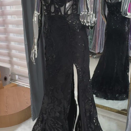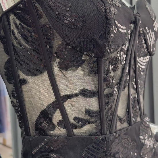 Vestido Sirena Negro con Corset Transparente y Lentejuelas